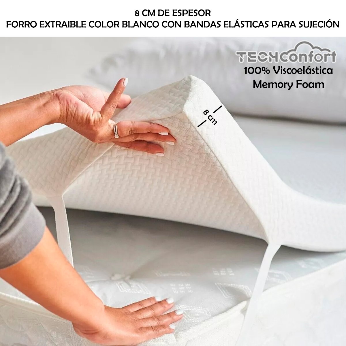 ACERCA DE ESTE PRODUCTO: Este topper o sobrecolchón está fabricado en espuma viscoelástica Memory Foam, con 8 cm de espesor se adapta a tus curvas y te abraza para dormir. Se reajusta a tu cuerpo de forma delicada y suave, haciendo que tu compañero(a) no sienta movimientos bruscos durante el sueño. Se adapta a tu temperatura corporal logrando un descanso confortable. La cómoda espuma con memoria se hunde suavemente para aliviar puntos de presión y distribuye el peso de manera uniforme. Una forma cómoda y económica de rejuvenecer un colchón usado, suavizar un colchón duro y prolongar la vida útil del colchón nuevo. El material es antimicrobiano, por tanto, es resistente a los alérgenos, el moho y los ácaros del polvo. No se deforma, siempre vuelve a su forma original.